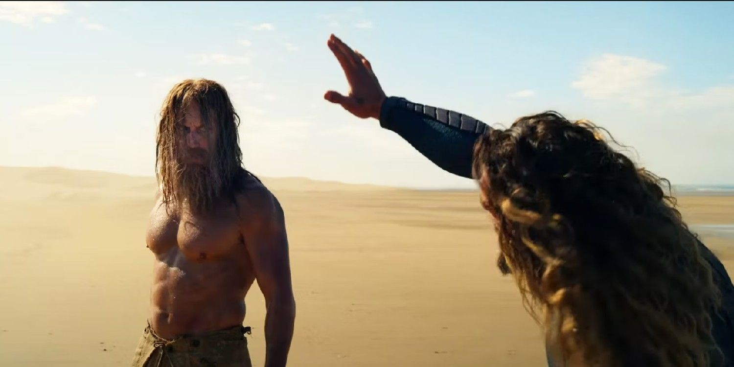 Escena de pelea en la playa entre Aquaman, Orm y los desertores
