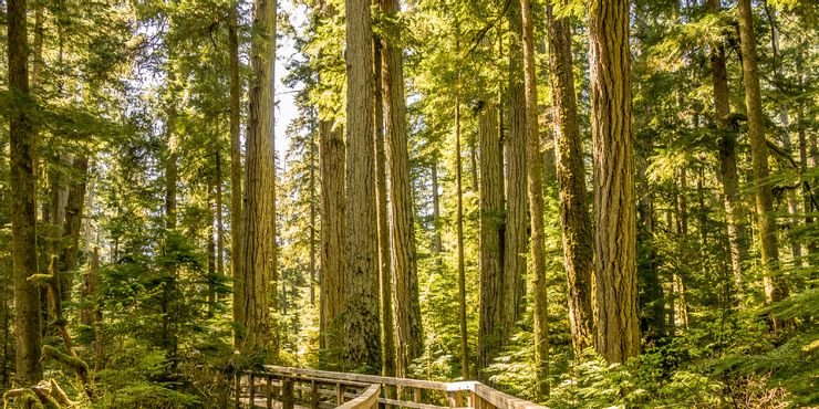 Telón de fondo del bosque – Cathedral Grove, Colombia Británica