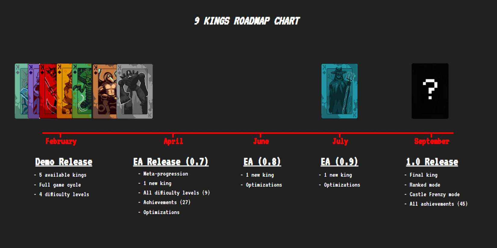 9 reyes Tiene planes bastante grandes para su futuro a lo largo de su período de un año previsto en el acceso temprano. En este momento, siete de los nueve reyes titulares se han puesto a disposición, y el desarrollador tiene la intención de agregar el resto durante el período de acceso temprano. El desarrollador Sad Socket también ha provocado modos de juego adicionales, ventajas y más llegando al juegopor lo tanto, los fanáticos y recién llegados pueden esperar todo eso. Actualmente, el juego cuesta $ 14.99, pero de acuerdo con la página de Steam Store del juego, el precio puede aumentar cuando se agrega más contenido.