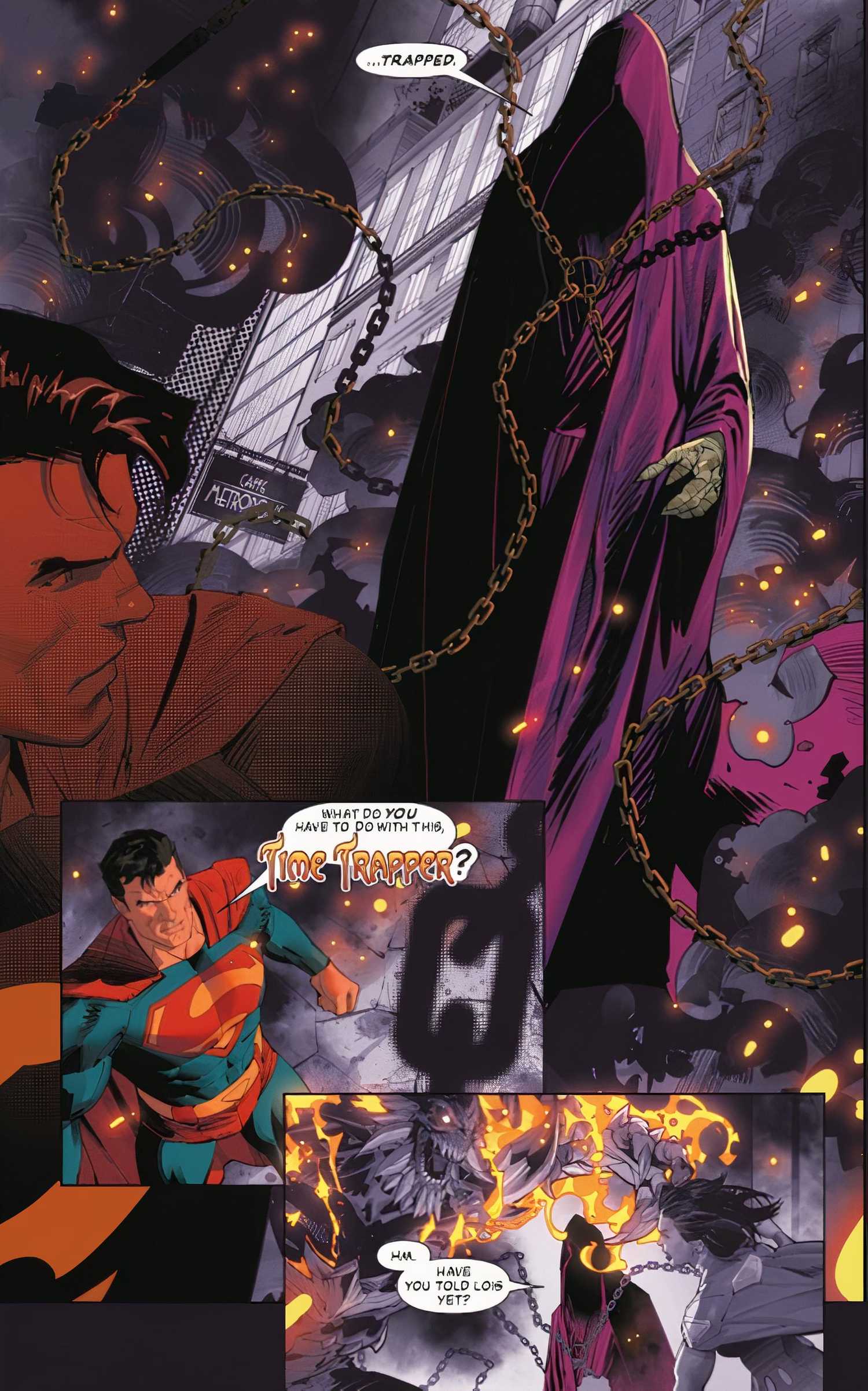 Sin embargo, antes de que pueda comenzar la batalla, el tiempo se detiene repentinamente y solo Clark no se ve afectado. El misterioso villano Time Trapper, una figura poderosa conocida por su habilidad para manipular el tiempo, pronto hace su entrada. En un giro impactante, la figura vestida con una túnica púrpura se quita la capucha para revelarse como Doomsday. Sin embargo, esta versión de Doomsday está lejos de lo que los fanáticos conocen; No sólo es inusualmente tranquilo y bien hablado, exhibiendo una inteligencia de la que carece el Doomsday original, sino que también luce una figura pequeña y ágil. eso contrasta marcadamente con la típicamente corpulenta criatura kryptoniana. A pesar de su nueva pequeña estatura, la piel puntiaguda, áspera y parecida a una roca de Doomsday permanece, lo que lo hace aún reconocible.