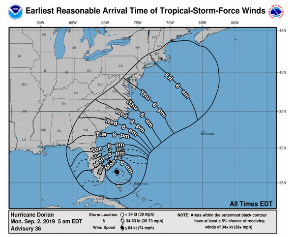 No obstante, la posibilidad de que Dorian pegue en Florida sigue presente ya que algunos modelos de pronóstico consideran que el huracán se desplazará hacia el oeste.