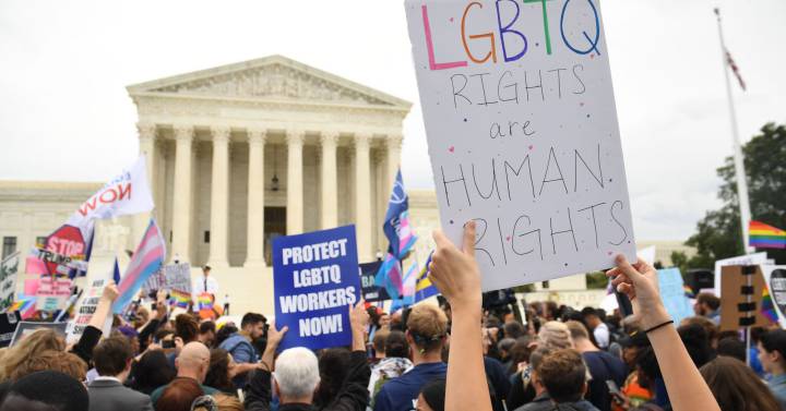 “¡Este es el aspecto de la democracia!”, “Igualdad”, “Los derechos de los gais son derechos humanos”. Los manifestantes coreaban cánticos ante las icónicas escalinatas del Supremo, las mismas ante las que se han celebrado o maldecido otras sentencias históricas, como la que legalizó el aborto en todo el país, la que acabó con la segregación racial en los espacios privados o la que validó el derecho a quemar la bandera de Estados Unidos. Todas estas decisiones que han transformado la sociedad estadounidense partieron de casos particulares. Este martes, allí dentro, frente a cinco jueces de perfil conservador y cuatro progresistas, se discutían los de tres personas particulares también llamadas a cambiar el futuro de la comunidad LGBT.
