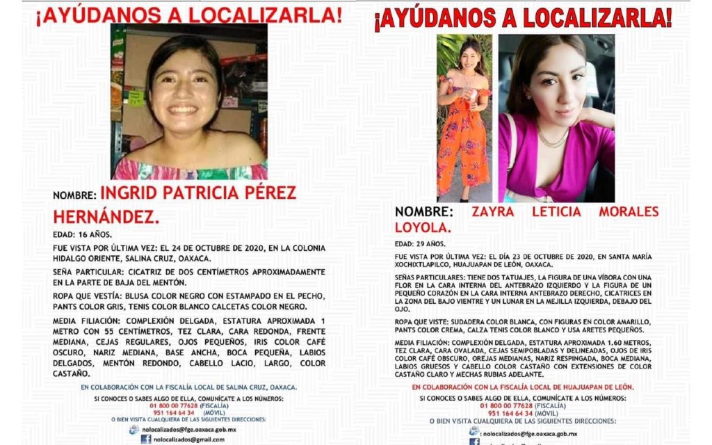 Ingrid Patricia desapareció la mañana del viernes en el puerto de Salina Cruz Oaxaca, mientras que la joven Zaira Leticia ocurrió durante la noche de ese mismo viernes, en la comunidad de Santa María Xochixtlapilco, en la mixteca oaxaqueña; al tiempo que las autoridades establecieron el protocolo de búsqueda.