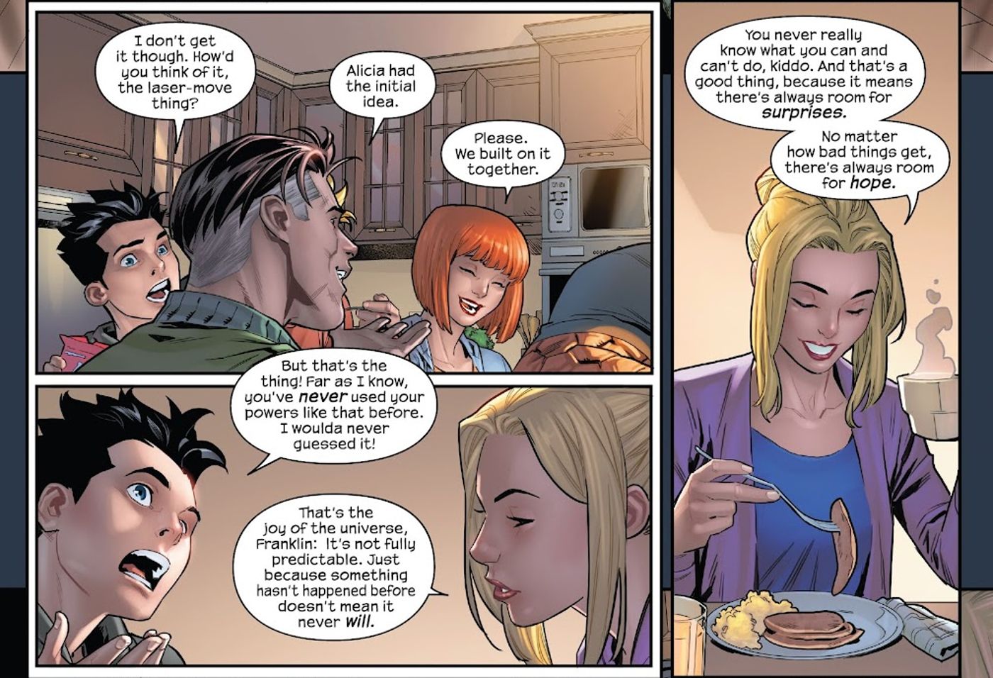 Más que cualquier otro equipo o héroe singular del Universo Marvel, los Cuatro Fantásticos son exploradores. Ellos también son héroes y con frecuencia se encuentran salvando el mundo, pero es su curiosidad lo que los define. La curiosidad era tanto una fuente de sus poderes como los rayos cósmicos que causaban los cambios físicos, y es lo que los impulsa a seguir adelante. Cuando Alicia sugiere que adopten una estrategia de un videojuego para destruir asteroides, los cuatro miembros del equipo están de acuerdo en segundos, lo que demuestra exactamente por qué muchas de sus victorias se derivan de mantener una mente abierta.