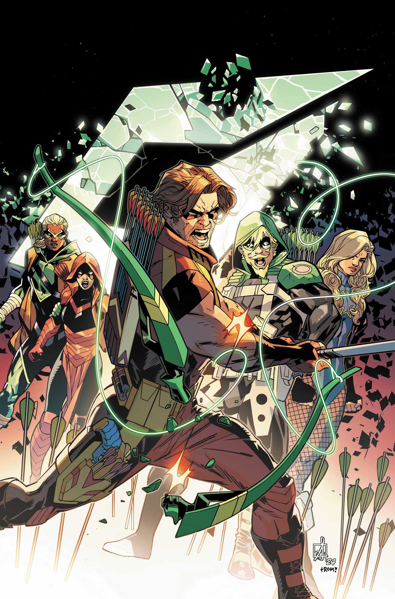 En Flecha Verde #16 Por Joshua Williamson, Amancay Nahuelpan, Sean Izaakse, Rómulo Fajardo Jr. y Troy Peteri, el equipo de Waller está empezando a perder a medida que los héroes comienzan a montar una defensa adecuada. Ella se apresura a reunir todas sus fuerzas, pero Green Arrow y su soldado multiversal Bright están en medio de una pelea en un avión de carga que se dirige directamente al Salón del Orden. El Equipo Arrow también está allí mientras Queen logra salvar a la hija del Arsenal, Lian, del villano cyborg. Connor Hawke se une a su padre y las dos Flechas Verdes luchan lado a lado para derrotar a Bright..