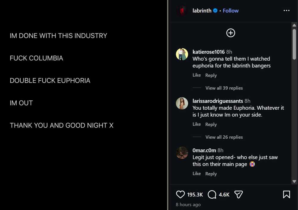 Desde su publicación de Instagram, muchos fanáticos se preguntan si el artista podría retirarse de la música por completo, pero aún no ha habido más información. Los fanáticos han acudido en masa a la publicación para compartir su amor por la música de Labrinth y su trabajo en la controvertida serie de HBO.