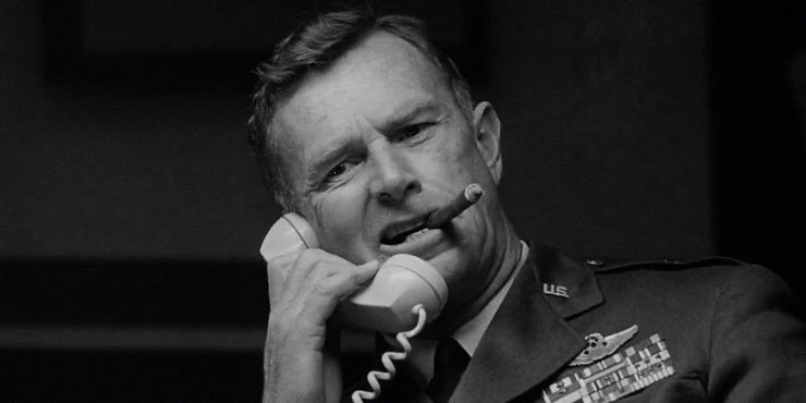 La paleta en blanco y negro también permitió a Kubrick jugar con las sombras y establecer una estética noir, como el General Ripper llenando la pantalla con bocanadas de humo de cigarro.