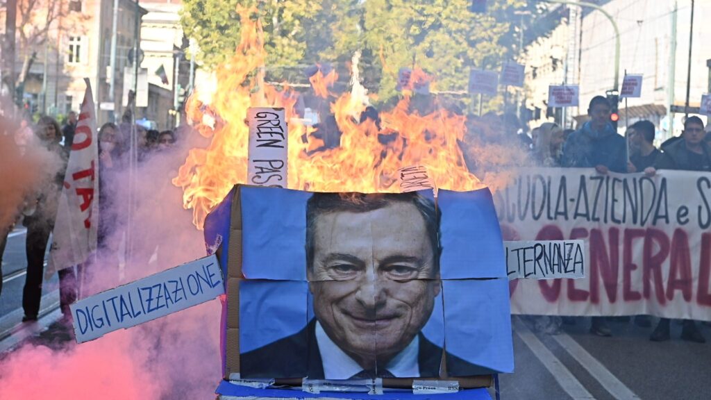 La realidad es que la medida no tiene parangón en el resto de Europa por su alto nivel de restricción. La oposición en la calle se suma a la que el Ejecutivo ha encontrado en el seno del Consejo de Ministros (los representantes de la Liga dudaron hasta el último minuto sobre si debían dar su apoyo a la decisión) y en el Parlamento. Es la primera vez que Draghi puede tener dificultades para llevar adelante una decisión política por sus consecuencias en la calle. Las primeras muestras se han visto también en algunas manifestaciones, donde se quemaron fotografías con su rostro. Un acto de vandalismo de una parte muy residual del país, pero que abre una grieta peligrosa por la que puede colarse una oposición al Ejecutivo al alza. Especialmente si partidos como Hermanos de Italia (el único fuera del Ejecutivo) aprovechan el incendio electoralmente.