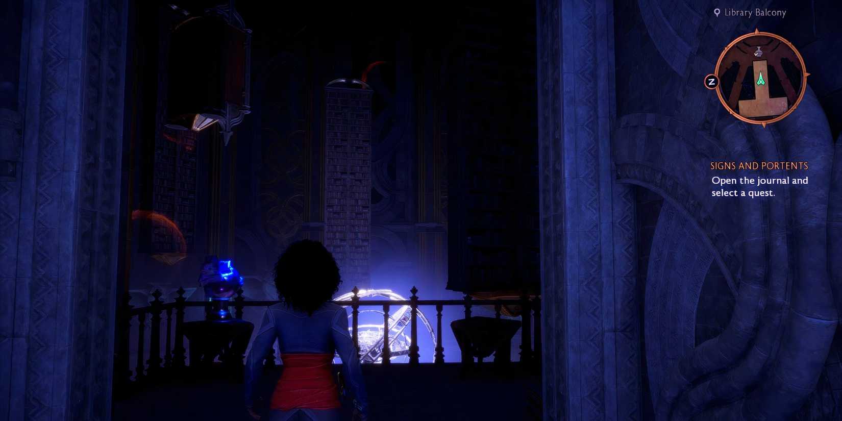 Una vez que Rook llegue al Balcón de la Biblioteca en Dragon Age: La Guardia del Velopueden recoger un botín decente repartido por todas partes. En la esquina izquierda del balcón, verán un artefacto azul similar a los de la búsqueda personal de Solas en Era del Dragón: Inquisición. Al interactuar con él, los estantes flotantes de la biblioteca se moverán para permitir que el Astrolabio en el centro del techo comience a funcionar correctamente nuevamente.