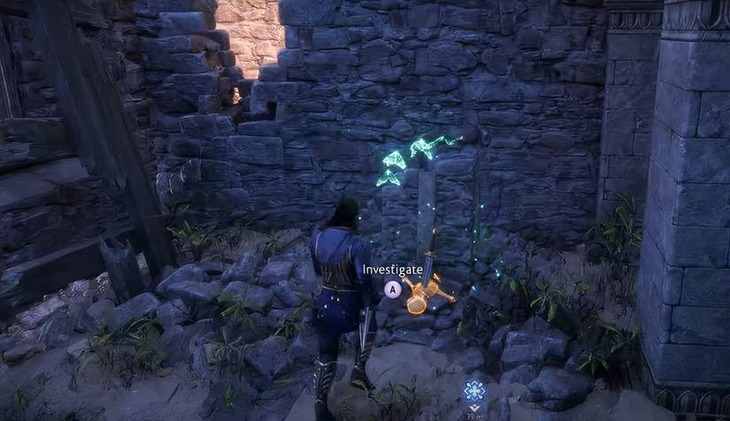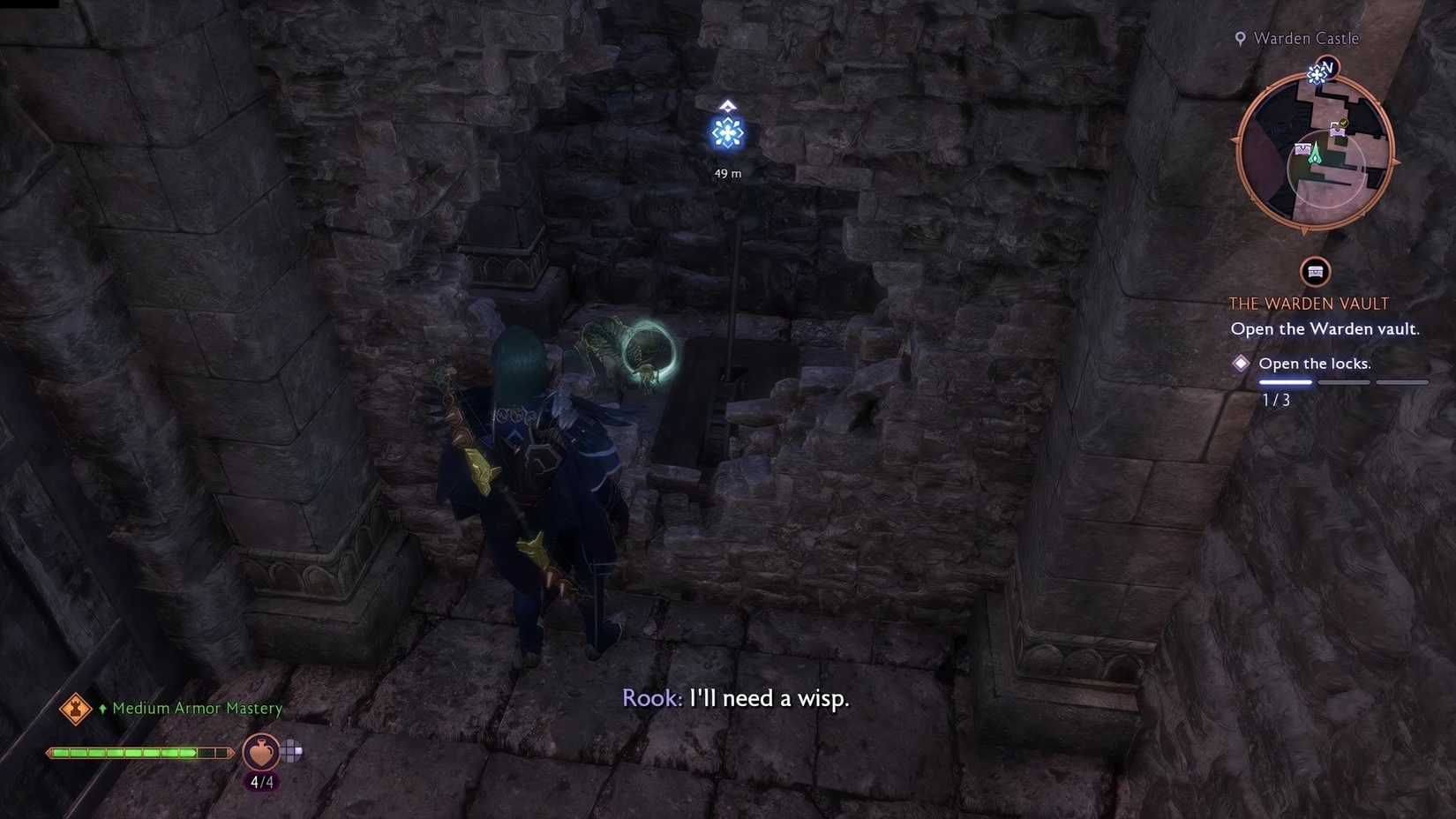 Para resolver el tercer rompecabezas y activar el último sello para acceder a Warden Vault, sigue el marcador de misión a través del Castillo y hasta el patio trasero. Directamente a la derecha de la puerta trasera del patio, busca y haz que Taash o Lyrium Dagger exploten otra olla de Gaatlok para dejar caer una escalera. Sube la escalera y sigue el camino para recoger el Wisp. Hay un límite de tiempo durante el tiempo que un Wisp seguirá a Rook, así que asegúrate de moverte rápidamente una vez que te siga y bajar la escalera, o tendrás que regresar y empezar de nuevo cuando desaparezca.