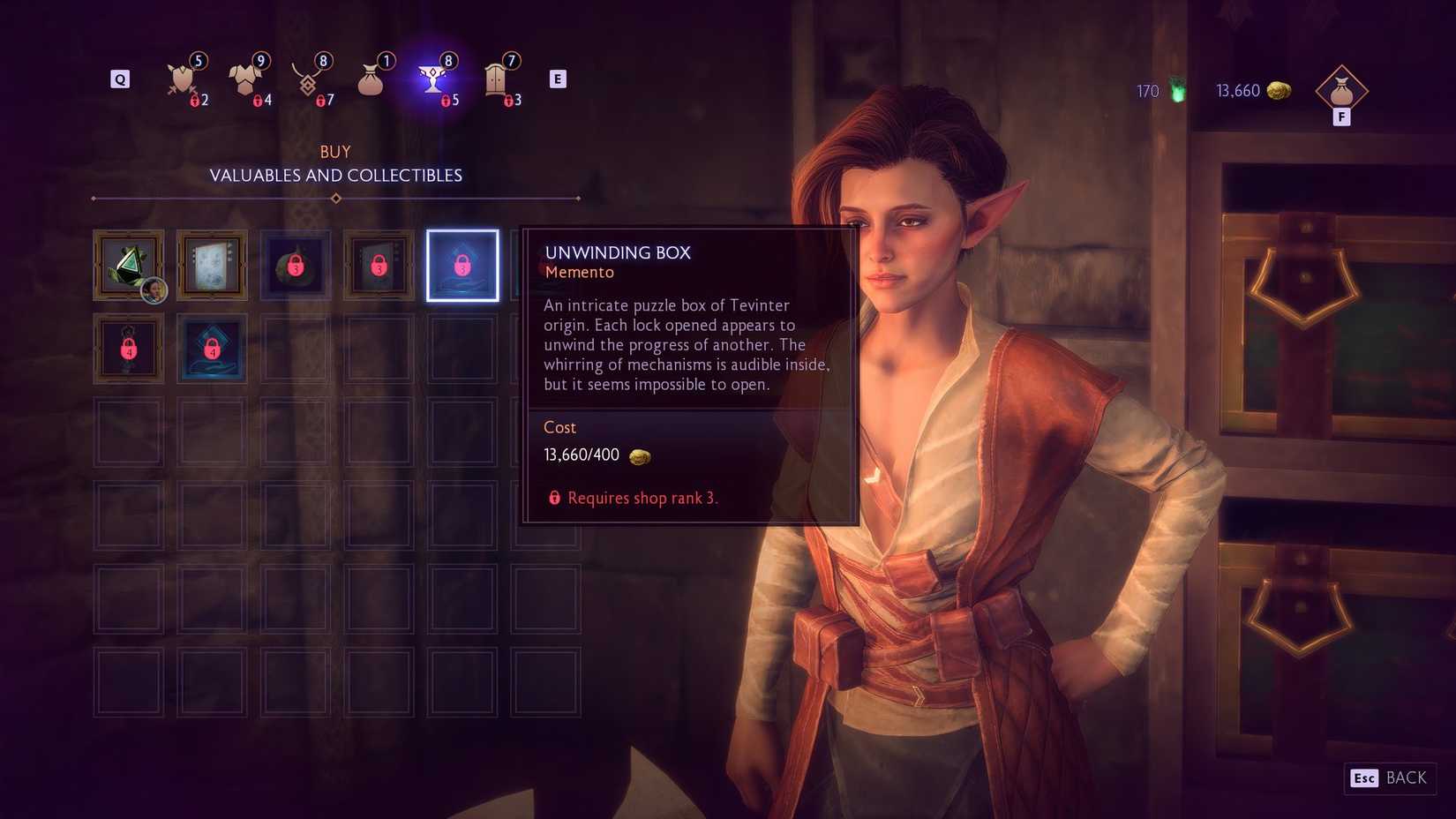 Para desbloquear la capacidad de actualizar el equipo a niveles más altos en Dragon Age: La Guardia del VeloRook también necesitará actualizar el Taller. Esto se puede hacer aumentando el poder del Cuidador. El poder del Guardián está ligado a Objetos coleccionables encontrados en Thedas llamados Mementos.. A menudo hay alguna facción o tradición regional a través de una entrada del códice asociada con cada uno de estos elementos, y se pueden comprar a los comerciantes, así como descubrirlos y saquearlos mientras se explora.