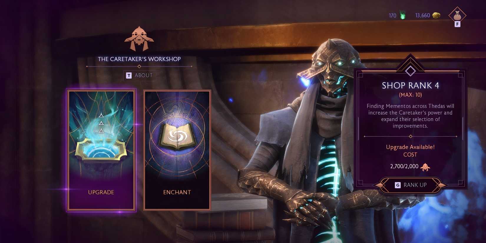 En el faro, fuera de la biblioteca, Rook puede encontrar el taller debajo de la estatua del lobo gigante. El cuidador aparecerá aquí cuando se le solicite y puede ayudar a Rook a mejorar el equipo de su equipo. En general, Rook puede mejorar todos los elementos de su inventario una vez por nivel del Taller.siempre que dispongan de materiales suficientes para ello.