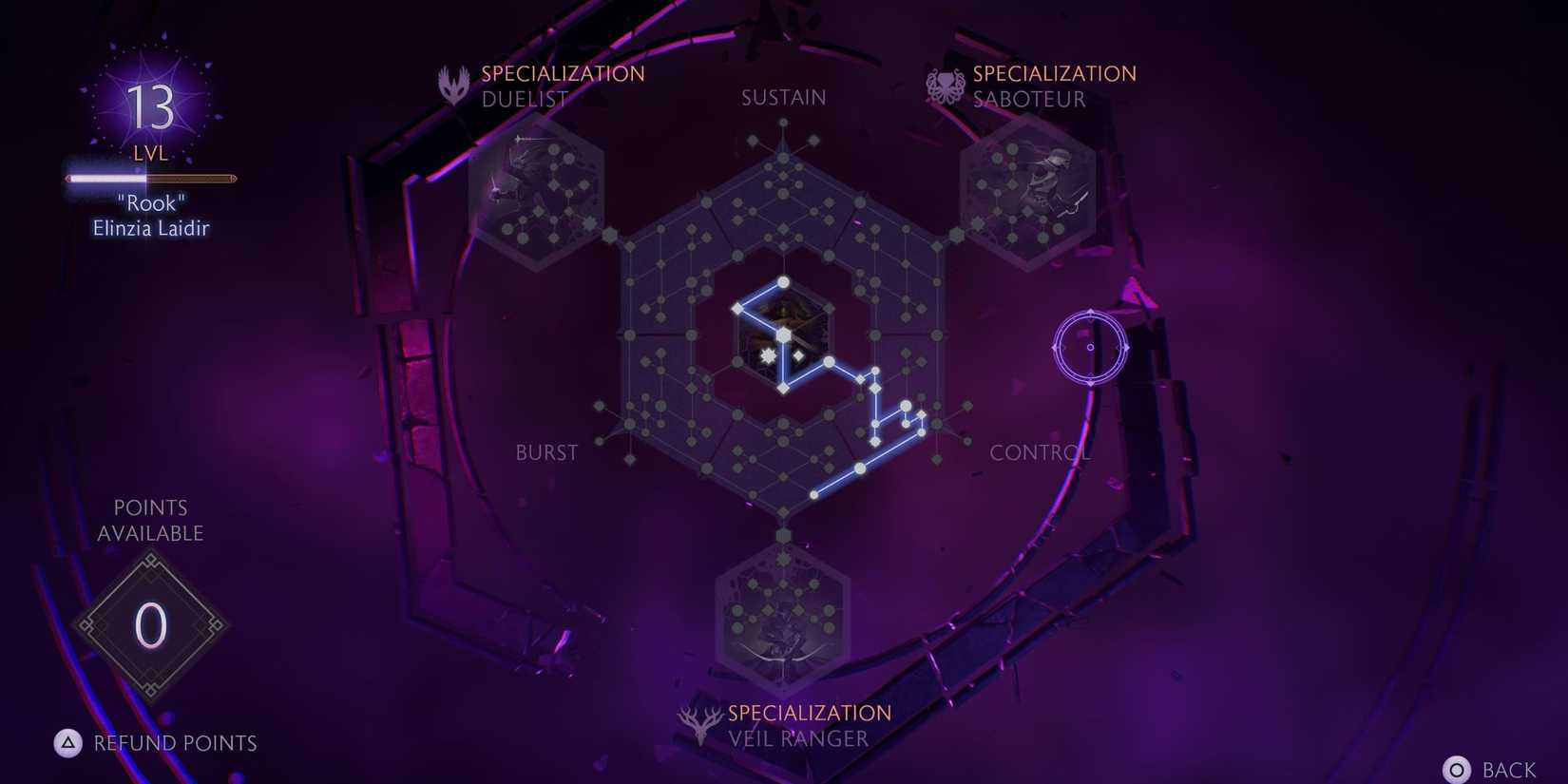 Una vez que se hayan reembolsado los puntos de habilidad de Rook, abra el árbol de habilidades y seleccione los nodos que desee respetar. Las especializaciones no cuestan puntos de habilidad, pero solo una puede estar activa. Al elegir cómo respetar, considere elegir primero un camino directo hacia la especialización deseada y luego seleccione entre otros nodos deseados alrededor del árbol de habilidades según sea necesario.