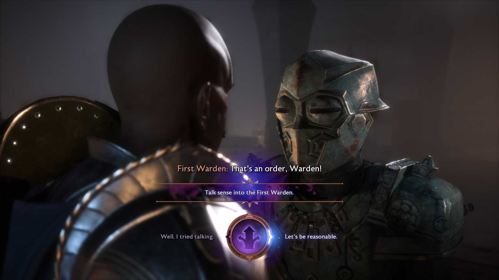 Aparte de la aprobación del compañero, las consecuencias de razonar con el Primer Guardián se desarrollan de manera similar a noquearlo, solo que con una diferencia de tono. Al final de “El asedio de Weisshaupt”, todavía aparecerá antes de la pelea con Razikale, pero en lugar de buscar su propia gloria, buscará la oportunidad de expiar sus errores pasados. Cuando se encuentre más adelante en “The Profane and the Lost”, de la misma manera, Blight lo corromperá y lo atrapará, pero estará completamente lúcido, y Davrin aún matará al Primer Guardián por piedad.