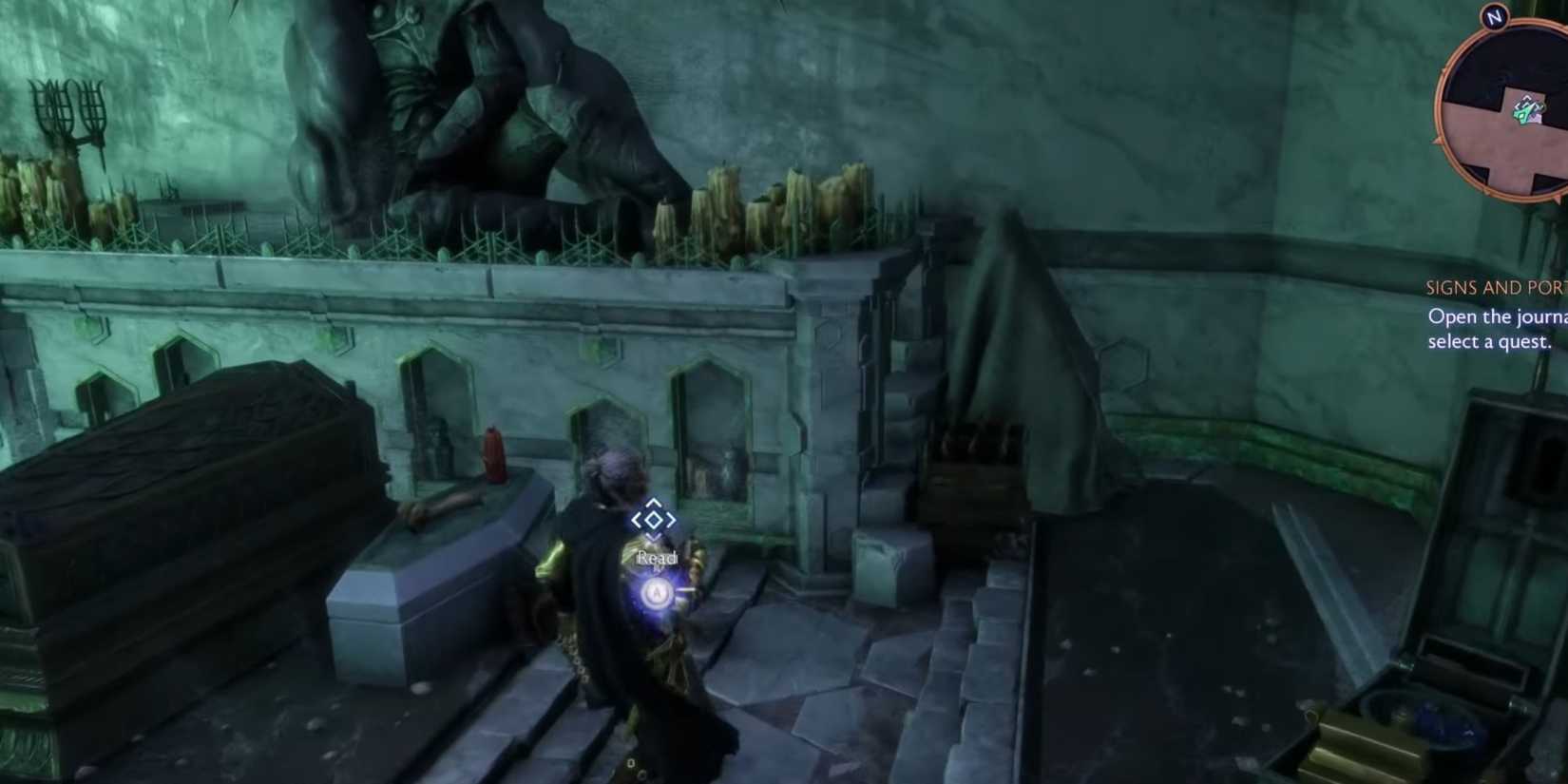 Una vez que retomes la misión, deberás investigar la habitación sellada. En el lado norte de la habitación, hay algunos ataúdes con un hombre muerto desplomado, apoyado en uno; Al lado del hombre muerto, hay una carta que te dirá que antes de que puedas abrir la puerta gigante y misteriosa, tendrás que cazar algunos demonios. Hay tres demonios en Thedas que mantienen esta puerta sellada, por lo que depende de ti y de tu equipo derrotarlos antes de que puedas entrar.