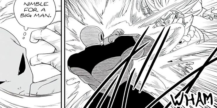 La pelea comienza con Broly demostrando que claramente no se queda atrás a pesar de las tremendas reservas de poder de Jiren. Jiren incluso se comenta a sí mismo que Broly es bastante ágil para un personaje de su tamaño, lo que sugiere que el Saiyajin no está inhibido por su masa muscular como lo estaba Trunks del Futuro cuando luchó contra Cell. Broly incluso intenta uno de sus movimientos más clásicos: aplastar la cabeza de su oponente contra una pared con las manos desnudas, pero Jiren está completamente desfasado. En este punto, el asesino del Universo 6, Hit, hace su aparición y se ofrece a ayudar a Jiren a eliminar a Broly antes de que se convierta en una molestia. Al estilo típico de Jiren, se niega y elige luchar contra Broly por su cuenta, ignorando el Time-Skip de Hit y noqueando al guerrero salvaje con un solo golpe.