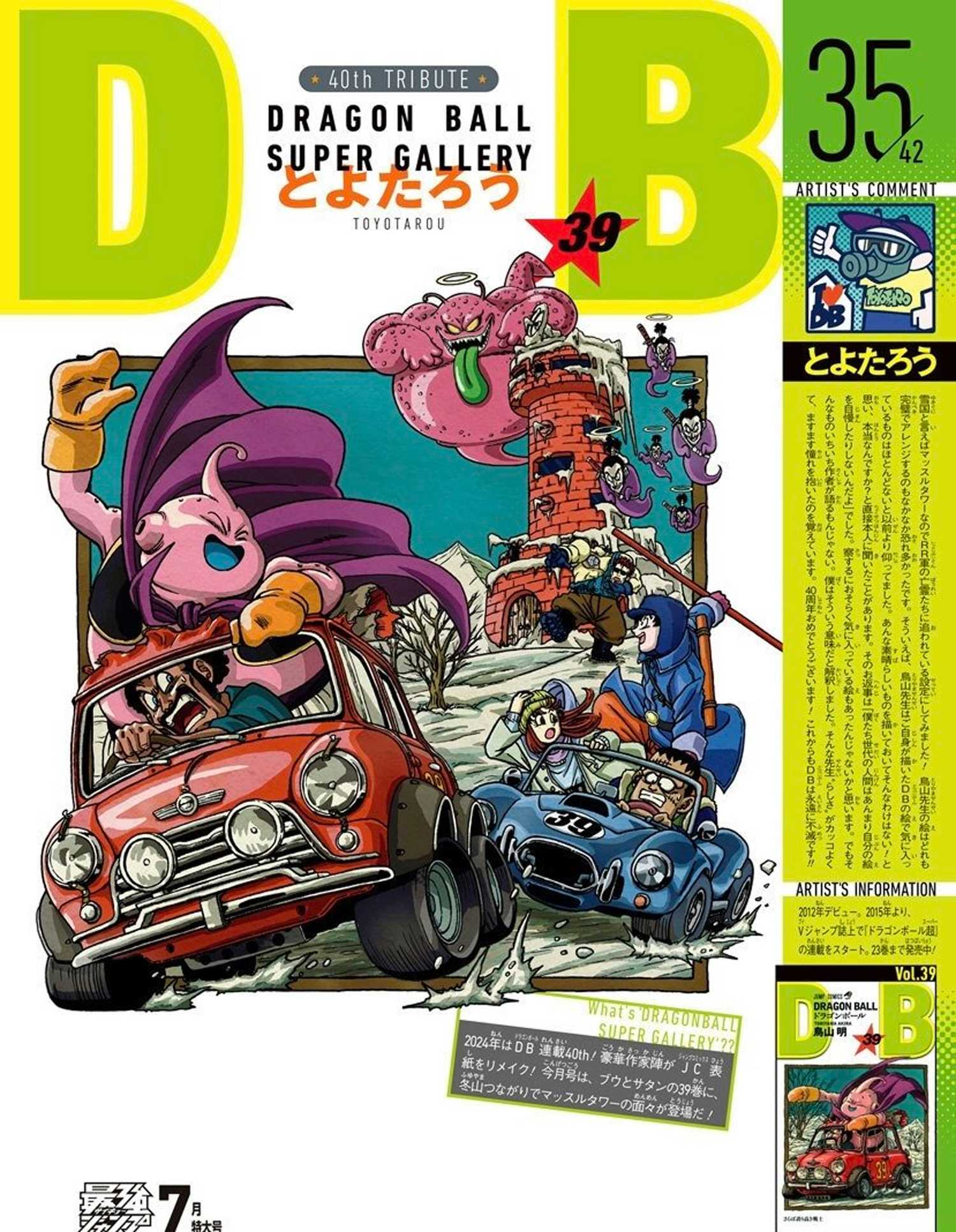 • La nueva portada de Toyotarou para la colección de manga del 40 aniversario muestra a Buu y Mr. Satan conduciendo un automóvil, con Goku y Eighter a cuestas.