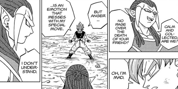 En el capítulo 81 de Dragon Ball Super, Granolah retoma su pelea con Gas mientras Goku y Vegeta permanecen incapacitados por una desagradable técnica de amplificación de la gravedad. Aunque Granolah lucha valientemente contra Gas, su rabia y su deseo de venganza lo dejan abierto de par en par mientras intenta matar a Elec y Gas se aprovecha al máximo de esto. Los brazos de Granolah están rotos y sus ojos quemados mientras Goku y Vegeta miran con horror. Para detener a Gas, Vegeta rápidamente le da a Goku el resto de su energía para que pueda salir del control de la gravedad y entrar en la refriega de la batalla una vez más. Goku no pierde el tiempo en encenderse en su forma Perfected Super Saiyan Blue y enfrentarse a Gas. En un intento de luchar a la par con su mortal oponente, Goku calma su ira y se enfoca, declarando “La ira es una emoción que interfiere con mi movimiento especial”.