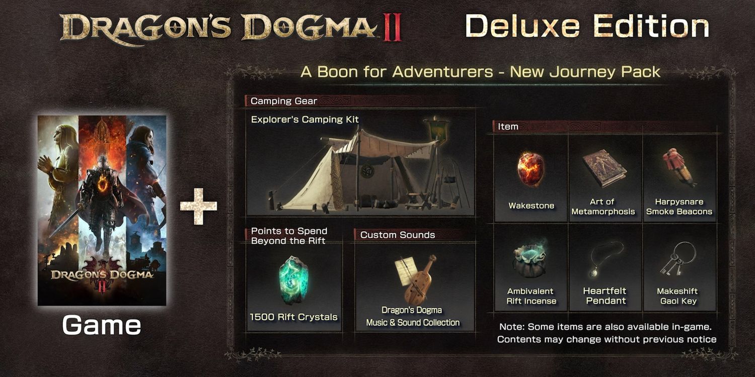 El Dogma del Dragón 2 La Edición Deluxe da derecho a los jugadores a una serie de productos digitales: equipo especial para acampar, cristales Rift “gastar más allá de la grieta“, una colección de música y sonido de Dragon’s Dogma y una serie de elementos del juego. No está claro hasta qué punto se pueden usar Camping Gear y Rift Crystals, pero es probable que la colección de música sea una copia digital de la DD2 banda sonora. La mayoría de Dogma del Dragón 2 Los elementos del juego de la Edición Deluxe son igualmente misteriosos en su uso, aunque parecen ser elementos iniciales del juego, al igual que los bonos de reserva. Por ejemplo, un artículo de la Edición Deluxe es una llave de cárcel improvisada y la Dogma del Dragón 2 sitio web menciona su historia “comienza en una cárcel subterránea“.