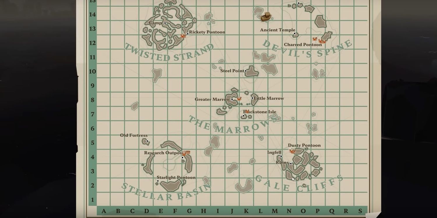 La figura en rojo cuelga en la sección L14 del mapa, justo en la parte superior. El primer y tercer pez que necesitan sacrificar, la anguila bromista y el tiburón con volantes, se pueden encontrar un poco al este, en la sección noroeste de Devil’s Spine. Los cardúmenes de Cusk Eels son específicos de la noche y se pueden encontrar alrededor de la sección N14. Las escuelas de Frilled Shark pueden aparecer en esa área o en las partes alrededor de O12 en cualquier momento del día.