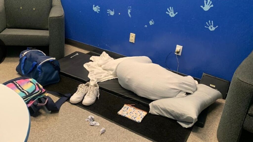 En imágenes proporcionadas por algunos empleados de la dependencia, se mira a los niños dormidos sobre mesas de conferencias o en colchonetas de yoga en el suelo, en habitaciones con luces que no pueden apagarse.