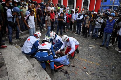 La Cruz Roja colombiana recoge el cadáver del funcionario de la Fiscalía linchado tras disparar contra dos manifestantes.