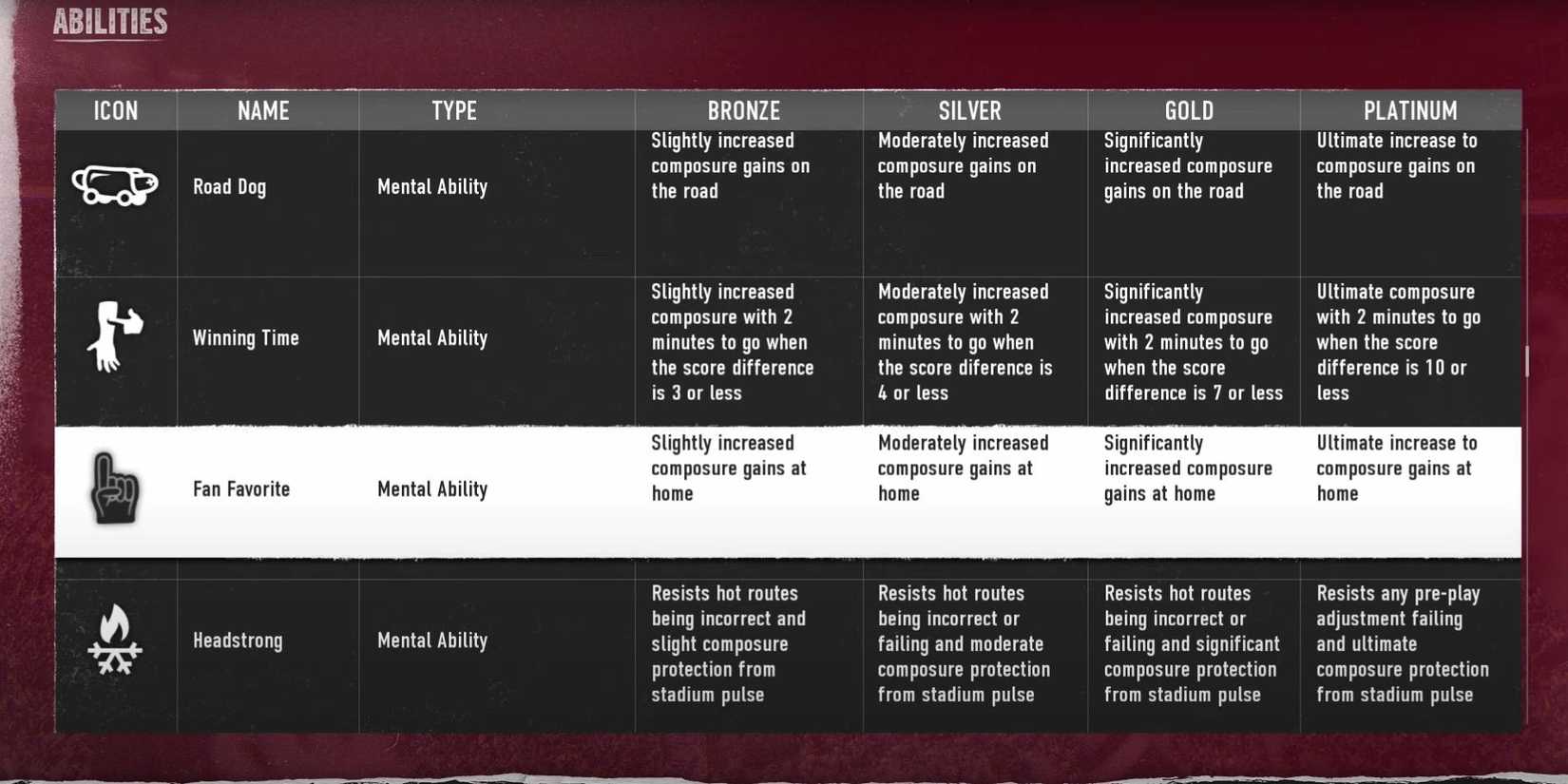 Dado que las habilidades mentales son pasivas, puede resultar difícil ver su efecto durante los partidos hasta que alcances su calidad Oro o Platino. Asegúrate de prestar atención a la estadística Composure antes de los partidos, ya que muchas de estas habilidades afectan directamente a esta puntuación. Algunas habilidades también son específicas de ciertas posiciones en el campo, como el pateador o el apoyador, por lo que No asignes habilidades a los atletas porque no les afectarán..