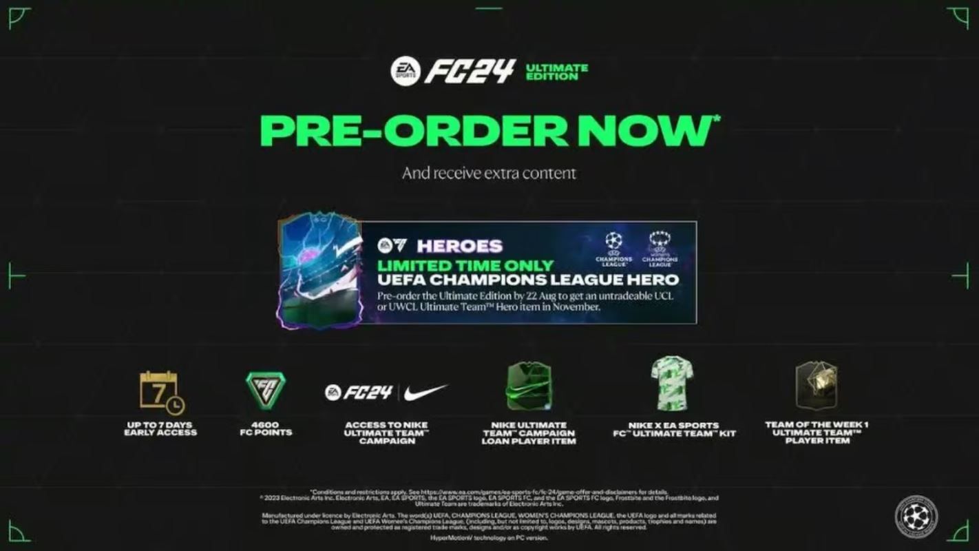 Hay dos versiones de EA Deportes FC 24 que se lanzará en septiembre. La Edición Estándar y la Edición Ultimate. La edición estándar del juego es solo el juego base para la plataforma elegida, a menos que se ordene por adelantado para recibir bonificaciones especiales. Ultimate Edition presenta el juego base con una portada especial de Ultimate Edition que presenta la foto grupal de los jugadores a lo largo de la historia. La Ultimate Edition también proporciona 4600 FC Points y un artículo de jugador de héroe UCL/UWCL intransferible aleatorio si se compra antes del 27 de noviembre de 2023. Los jugadores en Nintendo Switch están limitados ya que solo la Edición estándar de EA Deportes FC 24 está disponible para esa plataforma.