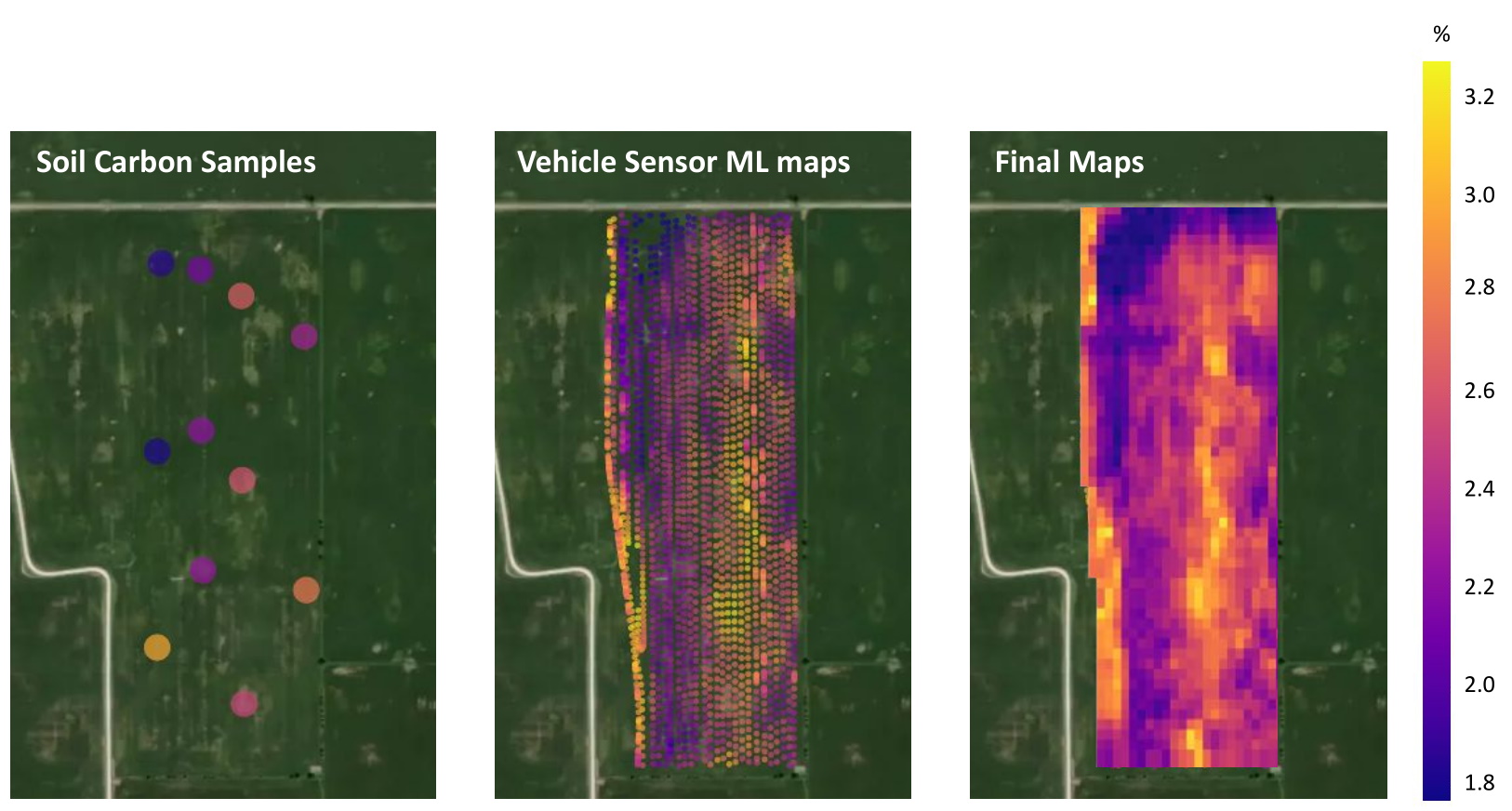 El aprendizaje automático está en el corazón del par de herramientas de la compañía, GroundOwl y C-Mapper (C como en carbono). El equipo entrenó un modelo que reconcilia los datos sin contacto con muestras tradicionales tomadas a una tasa mucho más baja, aprendiendo a predecir las características del suelo con precisión a un nivel de precisión mucho más allá de lo que tradicionalmente ha sido posible. El hardware de imágenes se puede montar en tractores o camiones ordinarios y obtiene lecturas cada pocos pies. El muestreo físico todavía ocurre, pero decenas en lugar de cientos de veces.