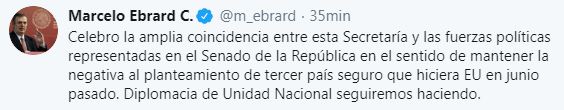 “Celebro la amplia coincidencia entre esta Secretaría y las fuerzas políticas representadas en el Senado de la República en el sentido de mantener la negativa al planteamiento de tercer país seguro que hiciera EU en junio pasado. Diplomacia de Unidad Nacional seguiremos haciendo”, se lee en un tuit publicado en al cuenta de Marcelo Ebrard.