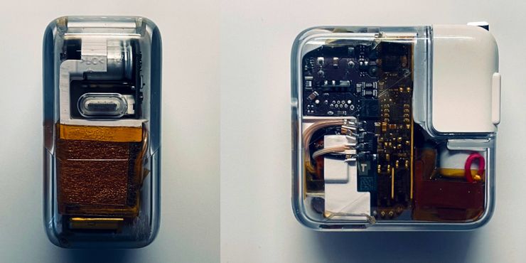 Los materiales translúcidos a veces se utilizan en prototipos para proporcionar a los ingenieros una mejor visión del diseño interno de un producto. Con los AirPods, las fotos muestran la gran cantidad de pegamento que se utilizó. El adaptador de corriente USB-C de 29 W es muy interesante ya que es el primer adaptador de corriente USB-C de Apple y se presentó junto con la MacBook de 12 pulgadas. Lamentablemente, el portátil finalmente se suspendió y el adaptador de corriente de 29 W desapareció con él. El adaptador fue reemplazado más tarde por el adaptador de 30 W, que todavía se incluye con el MacBook Air.