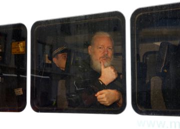 Julian Assange en el furgón policial donde fue trasladado tras su detención en la Embajada de Ecuador en Londres. En vídeo, las cinco claves de su historia. REUTERS | Vídeo: EPV