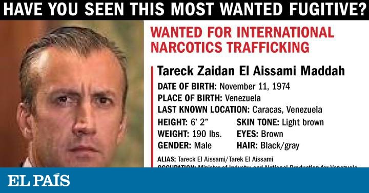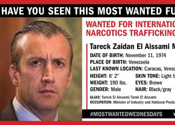 El cerco de Washington a la cúpula chavista se estrecha cada vez más. El Servicio de Migración y Control de Aduanas estadounidense ha emitido este miércoles una alerta que señala a Tareck Zaidan El Aissami Maddah, exvicepresidente de Venezuela y actual ministro de Industrias y Producción Nacional como uno de los 10 prófugos más buscados. Además del que es considerado uno de los hombres de confianza de Nicolás Maduro se incluyó también a Samark López Bello, acusado de ser socio de El Aissami en negocios de narcotráfico.
