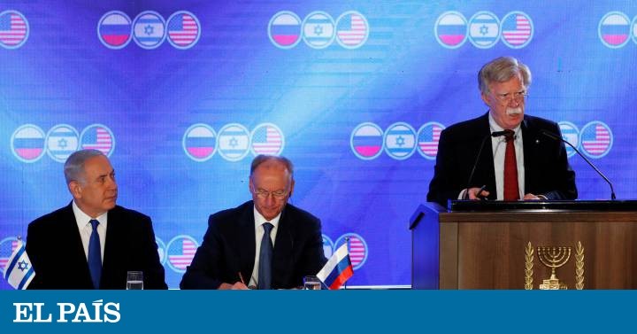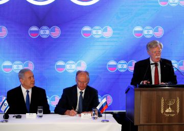 Netanyahu, junto a los consejeros de seguridad de Rusia, Nikolai Patrushov (centro) y de EE UU, John Bolton, el martes en Jerusalén. / Vídeo: Declaraciones de Bolton. RONEN ZVULUN (REUTERS)