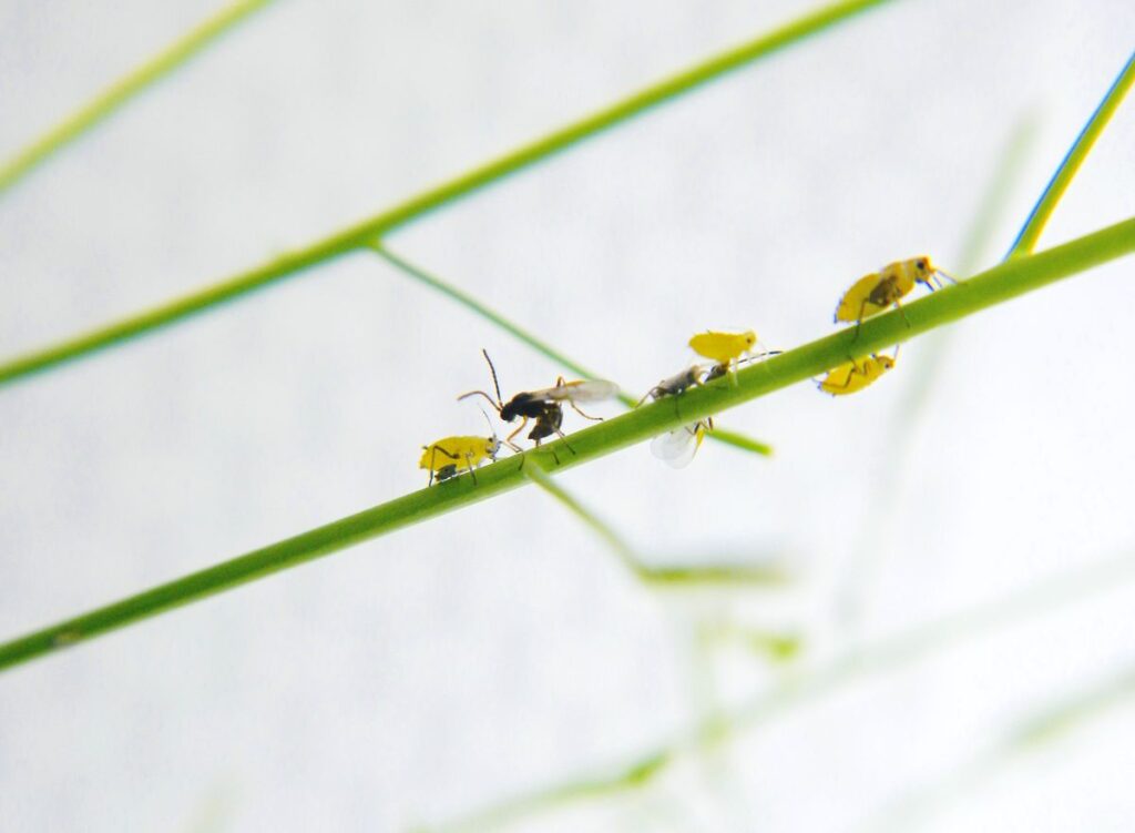 Ecosistema experimental con uno de los áfidos que se alimenta de arabidopsis y el parasitoide que lo ataca.Matthias Furler