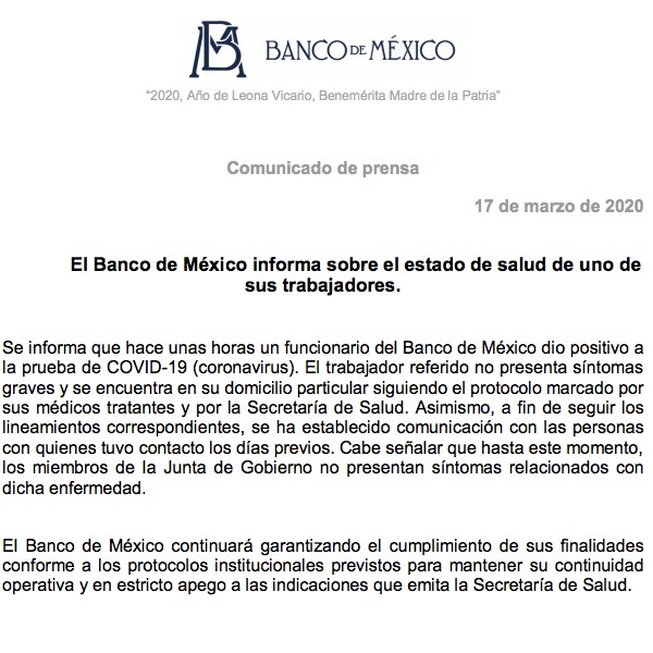 Después de la declaración del Banco de México de que uno de sus directivos dio positivo por el virus, la ABM y un número significativo de bancos instruyeron a quienes acudieron a la convención a laborar de forma remota por 15 días.