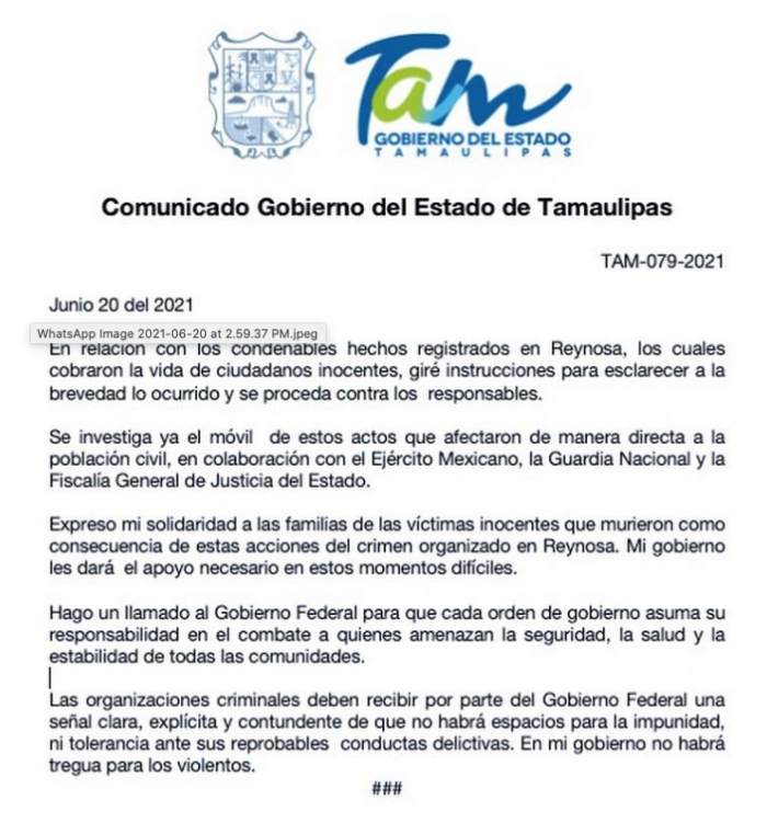 “En relación con los condenables hechos registrados en Reynosa, los cuales cobraron la vida de ciudadanos inocentes, giré instrucciones para esclarecer a la brevedad lo ocurrido y se proceda contra los responsables”.