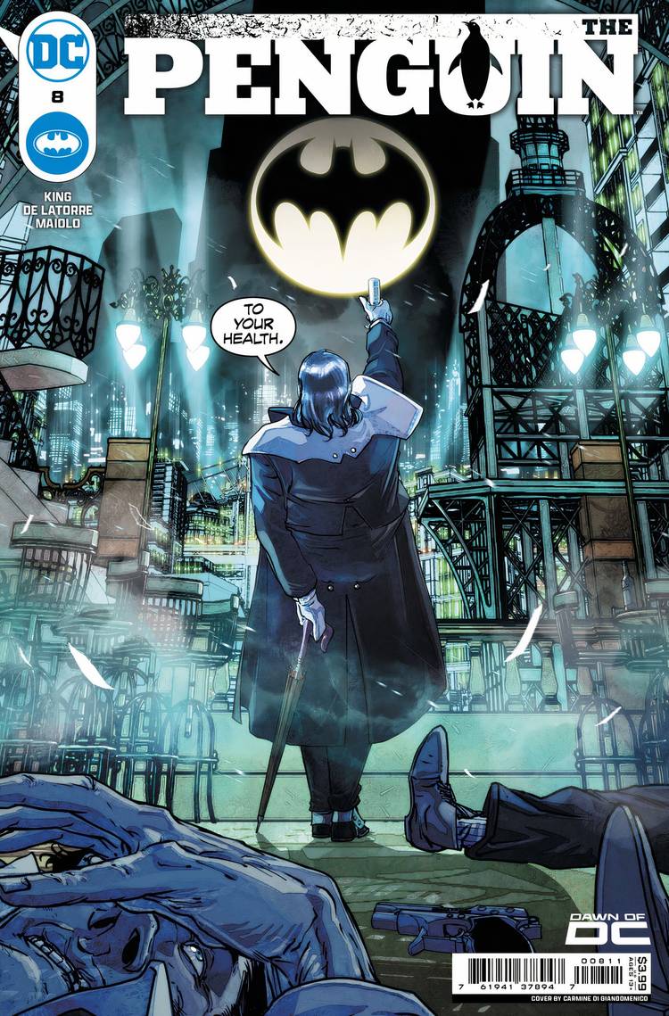 En El Pingüino #8 Por Tom King y Rafael de Latorre, Oswald Cobblepot ha regresado a Ciudad Gótica, dispuesto a recuperar su territorio de manos de sus hijos. El Pingüino se sienta a cenar en privado cuando es interrumpido por su compañero criminal, el Acertijo, que habla de los acuerdos secundarios del Pingüino con Batman.