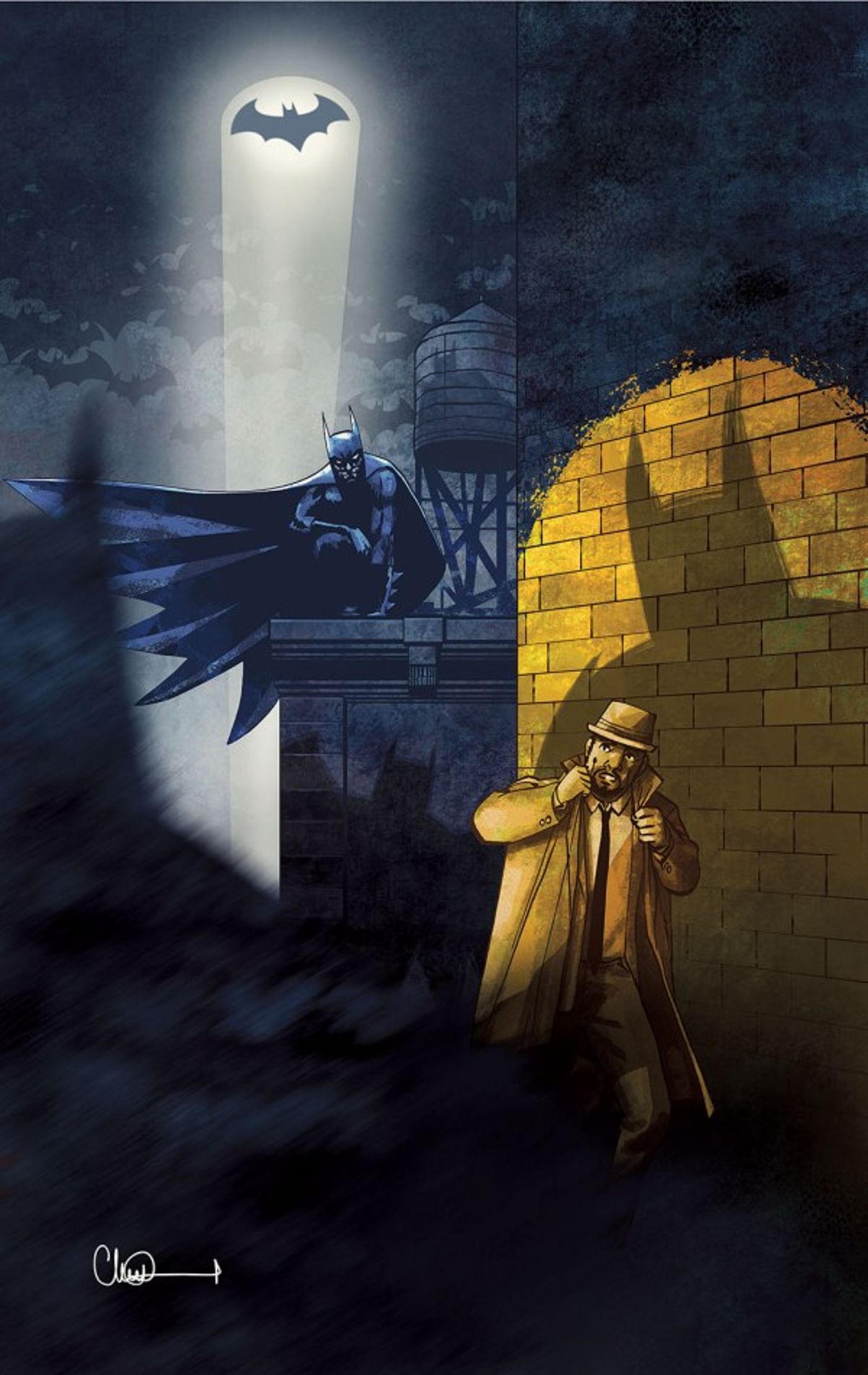 “/> Aunque Charlie Adlard está escribiendo una historia en blanco y negro para Batman: el valiente y el audaz #12, también dibujó una portada variante para el número, que emplea un uso mínimo, pero increíblemente efectivo, del color. Con la Batiseñal iluminando el cielo tormentoso sobre Gotham por la noche, el Cruzado Enmascarado está representado en los conocidos tonos azul noche oscuros. Capa capturada en perfecto aleteo, Batman se cierne (como ningún otro héroe de cómic puede replicar) sobre un hombre que corre a toda prisa por un callejón. El hombre, que aparece con el atuendo característico de un detective privado, está iluminado por una luz amarilla contundente.