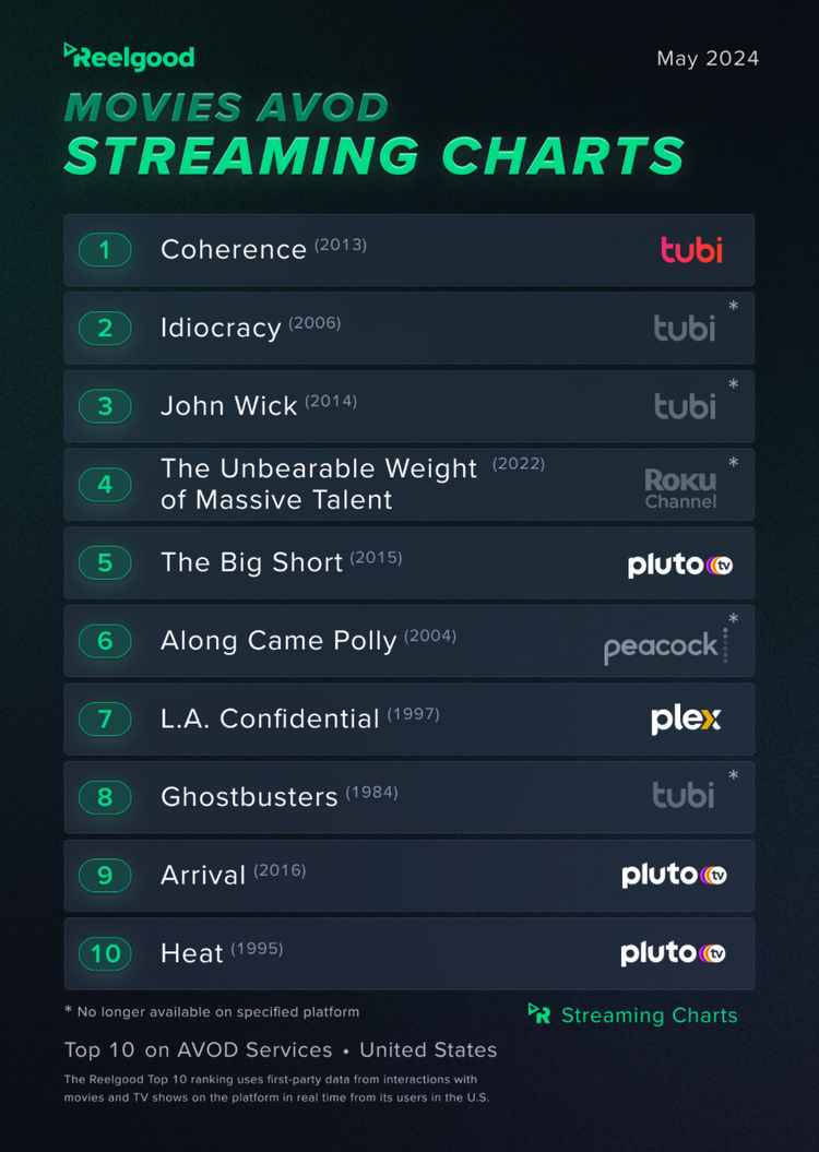 Un nuevo gráfico de Reelgood revela que Confidencial de Los Ángeles se ubica como el séptimo título más popular en AVOD (Video bajo demanda basado en publicidad) en los EE. UU. durante el mes de mayo.y. La película, que está disponible en Plex, supera títulos como Cazafantasmas, Llegaday Calor. Consulte la lista completa de las 10 mejores películas AVOD a continuación: