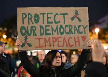 “Destituid al presidente depredador”, decía una impresión con luz sobre la fachada del Ayuntamiento de Los Ángeles. Gracias a un tiempo impropio de una noche de diciembre, los organizadores consiguieron reunir a unas 2.000 personas en el centro de la ciudad, además de pequeñas concentraciones en varios puntos de Los Ángeles.