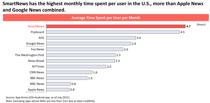 La aplicación de SmartNews ha demostrado ser muy pegajosa, en términos de atraer y mantener la atención de los usuarios. La compañía nos dice, citando los datos de App Annie de julio de 2021, que ve un tiempo promedio por usuario por mes en dispositivos móviles de EE. UU. Que es más alto que Google News o Apple News combinados.