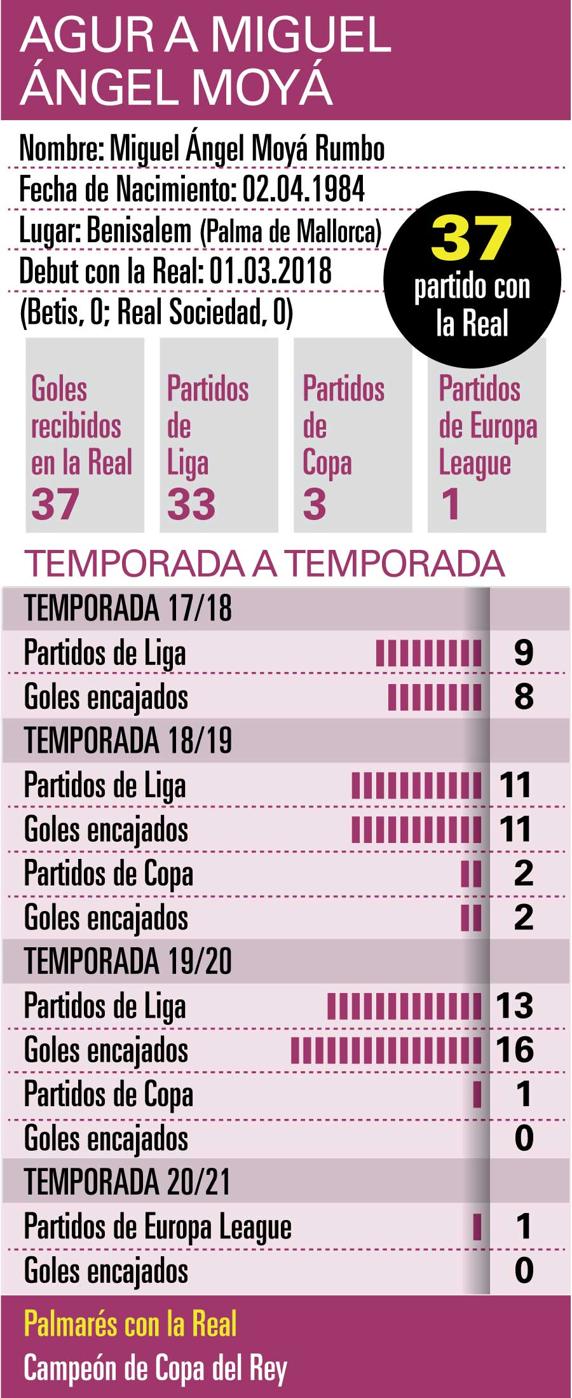 Moyá se marcha tras haber disputado 37 encuentros oficiales en la Real, en los que ha encajado 37 goles y ha dejado su puerta a cero en 11 ocasiones. La regularidad ha sido el rasgo más común en su rendimiento, pero ha tenido actuaciones brillantes, como la de Mestalla (0-0) en la 2017/18 o ante el Atlético (2-0) en la 2019/20.