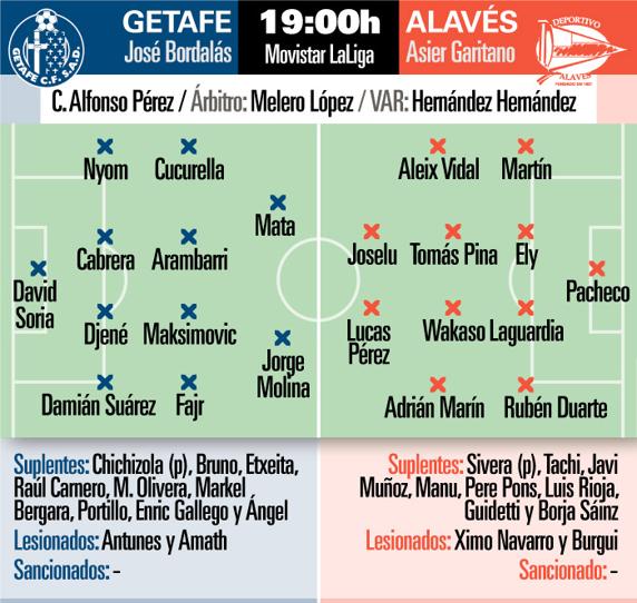 David Soria repetirá en la portería, con Damián Suárez en la parte derecha de la defensa, Nyom en la izquierda y Cabrera y Djené como centrales, Arambarri junto a Maksimovic o Bergara por el centro, con Fajr por la banda derecha y Cucurella por la izquierda, mientras que Molina y Mata serían los jugadores más adelantados.