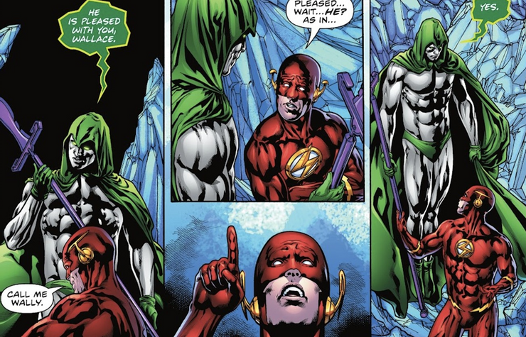 Aunque la palabra exacta “Dios” nunca se usa, los gestos de los personajes y el contexto de la escena implican fuertemente que el Todopoderoso es de quien se habla. Flash incluso señala torpemente al cielo, indicando a quién se refiere cuando habla con el Espectro. Eclipso es el antiguo espíritu de venganza, habiendo servido y luego traicionado a la Presencia, por lo que tiene sentido que el Dios de DC tome una mano directa para derribarlo al otorgarle a Wally inmunidad a sus poderes corruptores. Aún así, incluso para un superhéroe, recibir directamente nuevas habilidades directamente de Dios es notable.
