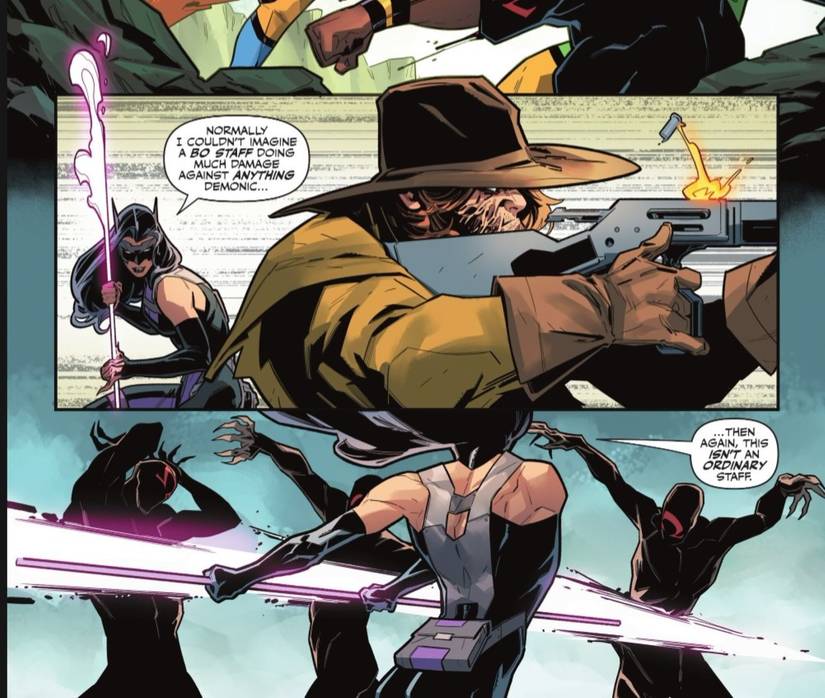 El traje mejorado de Huntress es uno de sus más rudos hasta ahora, y no solo visualmente. Viene con un arsenal mejorado que incluye Tanto su ballesta de la firma como un poderoso personal de Bo. Estas no son armas ordinarias, y Helena rápidamente lo demuestra en la batalla, utilizando las nuevas herramientas para enfrentar una amenaza sobrenatural a diferencia de todo lo que ha encontrado antes.