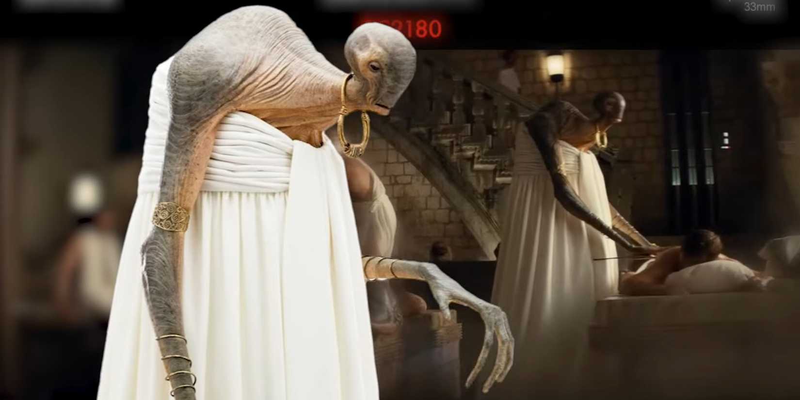 Lexo Sooger era masajista en El último Jedi, y si su escena hubiera permanecido en la película, habría aparecido durante la persecución de Finn y Rose por Canto Bight. Curiosamente, su historia de fondo ha sido explorada en un canon. Guerra de las Galaxias libro, ya que fue el tema de una de las novelas que aparecen en Canto Bight. Ese libro explicaba que Lexo Sooger fue un asesino antes de convertirse en masajista, ya que los Dor Namethians eran conocidos por su destreza.. También adoptó a una niña humana como su hija, y en el libro la salvó de las garras de un gángster local.