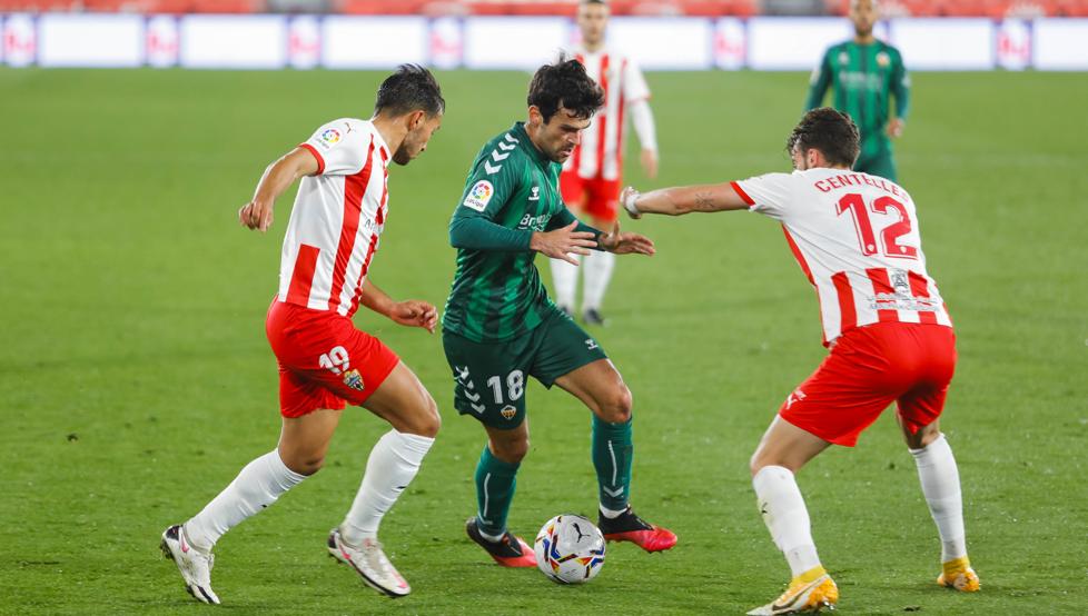 El encuentro comenzó sin ritmo y con una Unión Deportiva Almería espesa, sin lucidez para superar la presión adelantada ordenada por Juan Carlos Garrido que ahogó la salida de balón local.