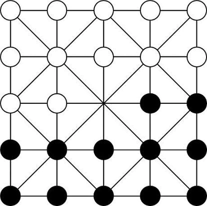 En la figura vemos la posición de partida del alquerque de 12. Los jugadores, por turno, llevan una de sus fichas a un punto de intersección vacío o, si pueden, “comen” una ficha contraria saltando sobre ella a un punto vacío. Gana quien captura todas las fichas contrarias o les impide mover. En el siglo XV, el alquerque de 12 se fusionó con el tablero de ajedrez y dio lugar a las damas. Invito a mis sagaces lectoras/es a llevar las 24 fichas del alquerque sobre el tablero de 8×8 manteniendo la estructura del juego. No sin antes calcular el número de jugadas posibles en el primer movimiento, en el segundo, en el tercero… ¿Se vislumbra alguna estrategia ganadora?