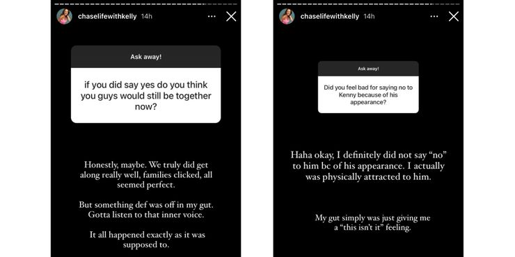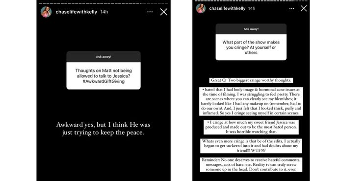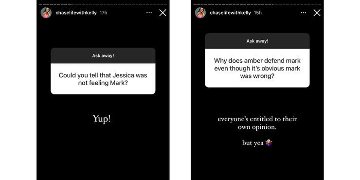 Durante la misma sesión de preguntas y respuestas de Instagram, Kelly también respondió preguntas sobre Jessica y Mark. Comenzó diciendo que podía decir que Jessica estaba “no sentir a Mark” inmediatamente. Cuando se le preguntó por qué Amber Pike sigue defendiendo a Mark, Kelly señaló que “todo el mundo tiene derecho a tener sus propias opiniones”. Sin embargo, Kelly parece estar de acuerdo en que Mark se equivocó en esa situación con Jessica. Otro fan preguntó qué pensaba Kelly de que Amber no permitiera que Matt Barnett hablara con Jessica. Ella estuvo de acuerdo en que todo es muy incómodo, pero sostuvo que Barnett estaba “solo tratando de mantener la paz” en su relación con Amber. En una de sus últimas historias de Instagram durante esta sesión de preguntas y respuestas, Kelly habló sobre las partes de El amor es ciego que la hacen temblar. Ella escribió, “Me avergüenza cómo mi dulce amiga Jessica fue producida y se convirtió en la persona más odiada”.
